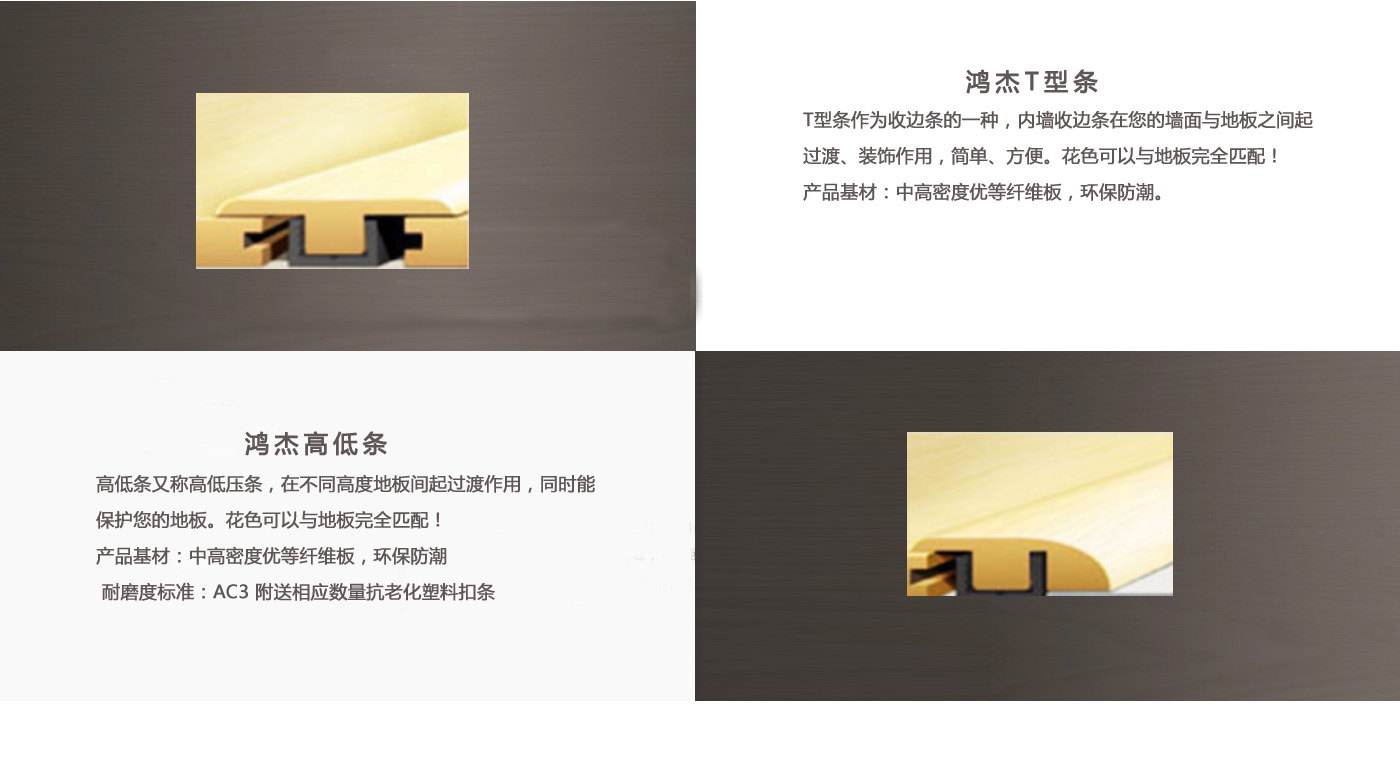 專業(yè)生產(chǎn)各類地板輔料。本廠成立于2008年,經(jīng)過(guò)嚴(yán)格的質(zhì)量控制,已開(kāi)發(fā)出SPC、WPC、層壓板三種不同的壓花材料。每一種材料都有超過(guò)7種不同的過(guò)渡型材,如t型線、減速器、端蓋、四分之一圓、樓梯前鼻、樓梯板、踢腳板等。    SPC和WPC是我們的新產(chǎn)品,在世界各地越來(lái)越受歡迎。各種造型將達(dá)到您的個(gè)性化需求,100%匹配您的SPC, WPC或乙烯基地板的顏色。     我們的傳統(tǒng)產(chǎn)品——層壓板是世界領(lǐng)先的產(chǎn)品之一,具有熱壓耐磨層加工技術(shù),高溫高壓。其質(zhì)量可靠,品種齊全,經(jīng)久耐用,耐磨,使層壓板成型經(jīng)久不衰。     我公司不僅與國(guó)內(nèi)一些大型、信譽(yù)良好的地板生產(chǎn)廠家和代理商建立了長(zhǎng)期的合作關(guān)系,產(chǎn)品還出口到臺(tái)灣、日本、菲律賓、美國(guó)、加拿大、非洲、澳大利亞、歐洲等國(guó)家和地區(qū)。 歡迎來(lái)廠參觀、洽談業(yè)務(wù)。
